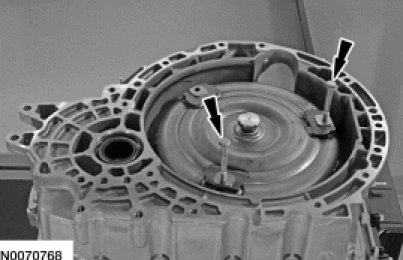 Install two 10 mm x 1.50 bolts into the torque converter 6 to 8 turns to assist in handling the torque converter and install the torque converter in the transaxle.
