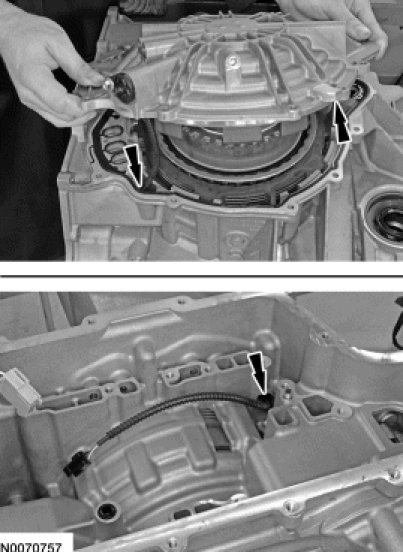 108. Route the Turbine Shaft Speed (TSS) sensor harness through the transaxle case to the valve body area and install the cover assembly.
