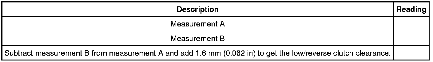 95. Subtract measurement B from measurement A and add 1.6 mm (0.062 in), to compensate for the thickness of the gasket, to get the low/reverse clutch clearance. The clearance should be between 1.01 mm (0.039 in) and 2.47 mm (0.097 in). If the clearance is out of range, check the low/reverse clutch pack for correct installation. If the low/reverse clutch pack is correctly installed, install a new low/reverse clutch pack.