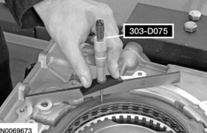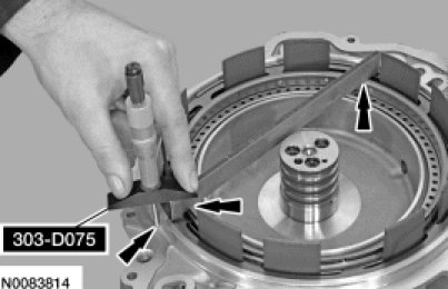 100. Using a suitable straightedge and the Depth Micrometer 303-D075, measure and record as measurement A, the distance from the transaxle case deck surface to a low point on the intermediate clutch wave spring.