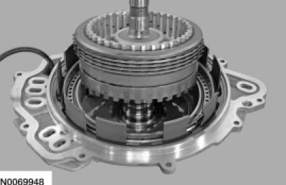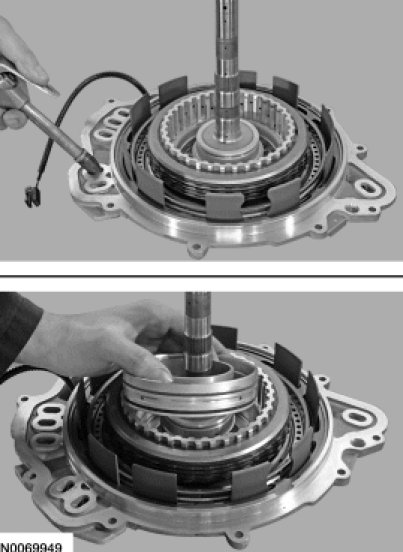 25. Position the overdrive/direct clutch assembly in the cover assembly, install the Dial Indicator Gauge with Holding Fixture 100-002 or a suitable dial indicator and position the plunger on the overdrive clutch pressure plate. Apply 483 kPa (70 psi) of air pressure to the overdrive clutch piston port while recording the clutch pack clearance on the Dial Indicator Gauge. The clearance should be between 1.13 mm (0.044 in) and 2.28 mm (0.089 in). If the clearance is out of range, check the overdrive clutch pack for correct installation. If the overdrive clutch pack is correctly installed, install a new overdrive clutch pack.