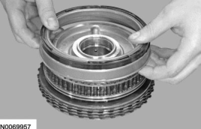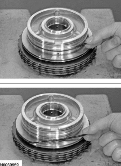15. NOTICE: Only compress the direct clutch piston return spring far enough to take the tension from the direct clutch cylinder off the snap ring. If the piston is compressed too far, the piston alignment tab may be broken off.