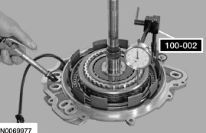26. Position the Dial Indicator Gauge with Holding Fixture 100-002 on the direct clutch pressure plate. Apply 483 kPa (70 psi) of air pressure to the direct clutch piston port while recording the clutch pack clearance on the Dial Indicator Gauge. The clearance should be between 0.98 mm (0.038 in) and 2.34 mm (0.092 in). If the clearance is out of range, check the direct clutch pack for correct installation. If the direct clutch pack is correctly installed, install a new direct clutch pack.