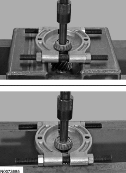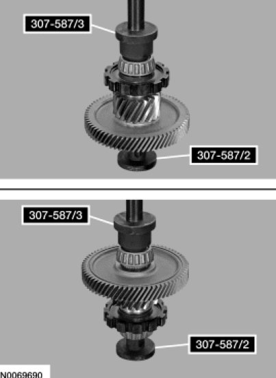 2. Using the Differential Bearing Installer and Guide 307-587 (307-587/2 and 307-587/3) and a press, install new transfer shaft bearings on the transfer shaft assembly.