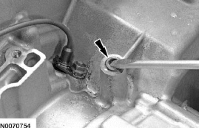 18. Remove the cover assembly and carefully route the TSS sensor wiring harness and electrical connector out of the transaxle case.