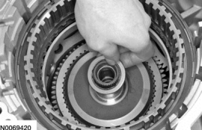 27. Remove the No. 6 center sun gear and the No. 5 center/rear planetary thrust bearings.