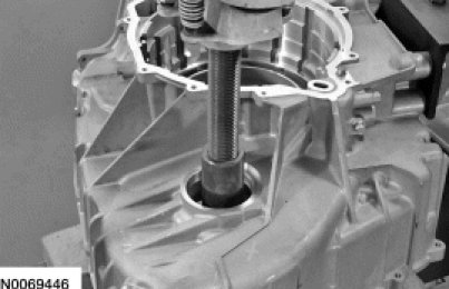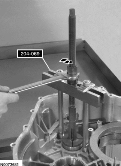 75. Using a wrench, turn the nut on the Front Wheel Hub Remover/Installer 204-069 to remove the transfer shaft bearing cup from the torque converter housing.