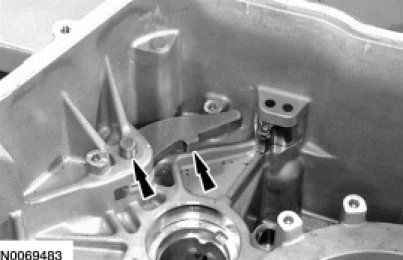 45. NOTICE: Carefully pry on the transaxle torque converter housing and the case to separate the torque converter housing from the case. Do not pry up on the silicone sealant mating surfaces, damage to the mating surfaces may occur. Carefully lift the torque converter housing off the dowel pins.