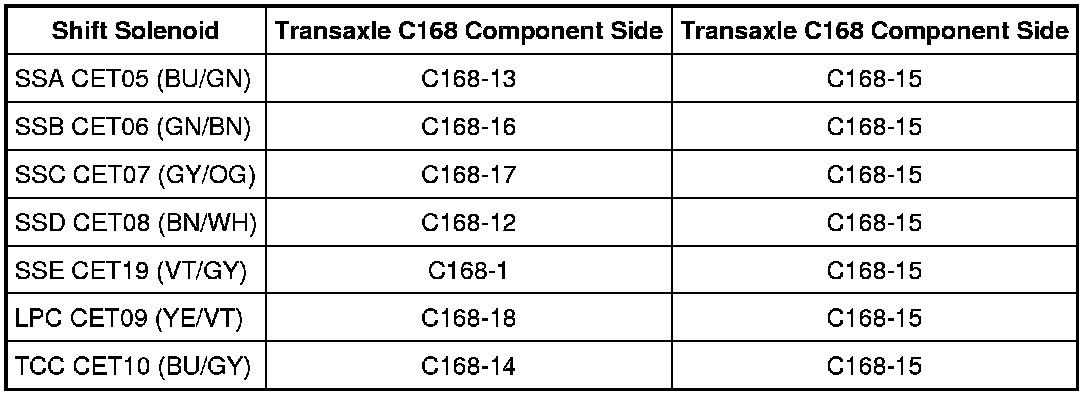 - Measure the resistance of the suspect solenoid circuit between PCM transaxle electrical connector and transaxle harness C168 using the following chart.