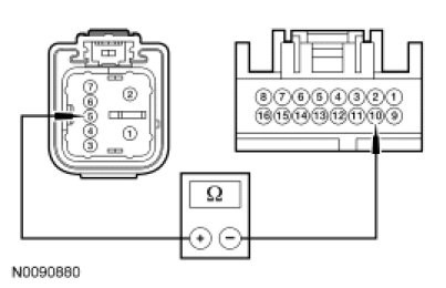 - Measure the resistance between RH front window motor C608-5, circuit CPW12 (GN/OG), harness side and LH front window control switch C504-10, circuit CPW12 (GN/OG), harness side.