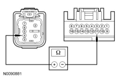 - Measure the resistance between RH front window motor C608-5, circuit CPW12 (GN/OG), harness side and RH front window control switch C604-3, circuit CPW12 (GN/OG), harness side.