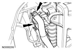 6. Using the Transmission Cooler Line Disconnect Tool, disconnect the transmission fluid cooler tubes from the transmission fluid cooler thermal bypass valve and remove the transmission fluid cooler inlet and outlet tube and hose assembly.