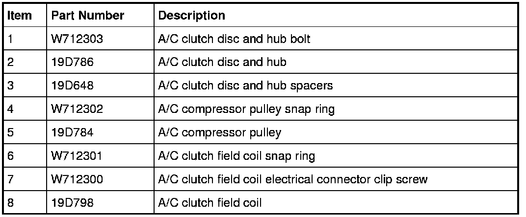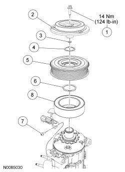 1. Remove the A/C compressor. For additional information, refer to Air Conditioning (A/C) Compressor- 2.5L Service and Repair or Air Conditioning (A/C) Compressor- 3.0L, 3.5L Service and Repair.