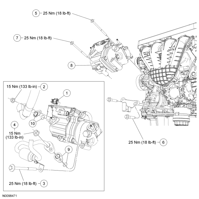 8. Remove the A/C compressor suction fitting nut and disconnect the fitting.