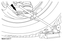 1. Position a suitable surface gauge (such as Starrett 57D Surface Gauge), on a flat, level surface and adjust the arm of the gauge until the scriber point is located in the center of the front lower arm-to-subframe bolt.