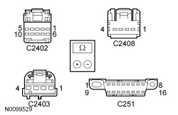 - Measure the resistance between the FCIM (Front Controls Interface Module) , harness side and the Data Link Connector (DLC) harness side as follows: