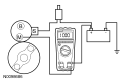 7. Remove the cables from solenoid B-, S- and M-terminals. Clean the cables and connections and reinstall the cables to the correct terminals. Repeat Steps 3 through 6. If the voltage drop reading is still greater than 0.8 volt when checked at the M-terminal and less than 0.8 volt when checked at the B-terminal, the concern is in the solenoid contacts. Install a new starter motor. Refer to Starter Motor- 2.5L , Starter Motor- 3.0L or Starter Motor- 3.5L .