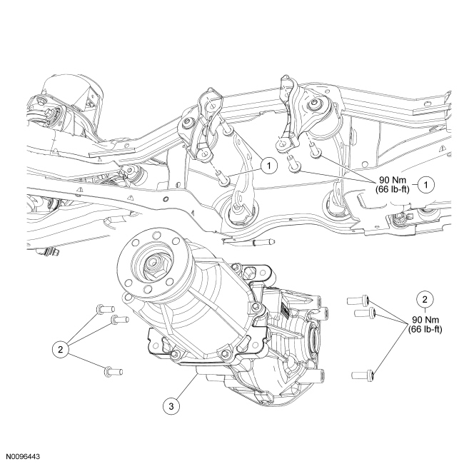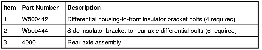 6. Remove the 3 LH side insulator or bracket-to-rear axle differential bolts.