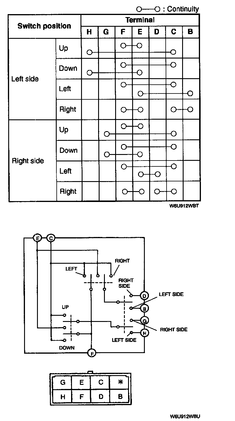 2. Inspect for continuity between the power outside mirror switch terminals by using an ohmmeter.