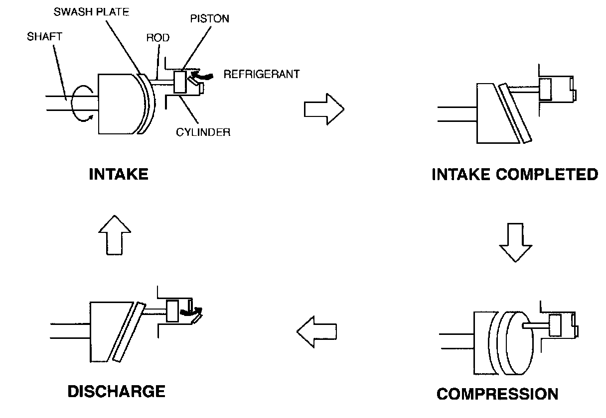 A/C Compressor Description- The A/C compressor is a swash plate type that has 7 cylinders. This A/C compressor has the advantages of low power consumption and improved performance at low speeds.