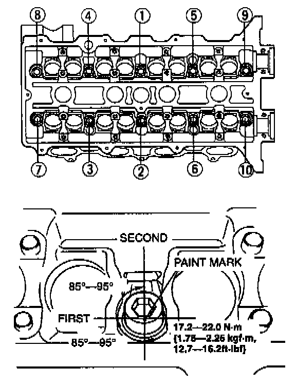 3. With the paint marks as a reference point, tighten the cylinder head bolts another 85° - 95° in the tightening order.