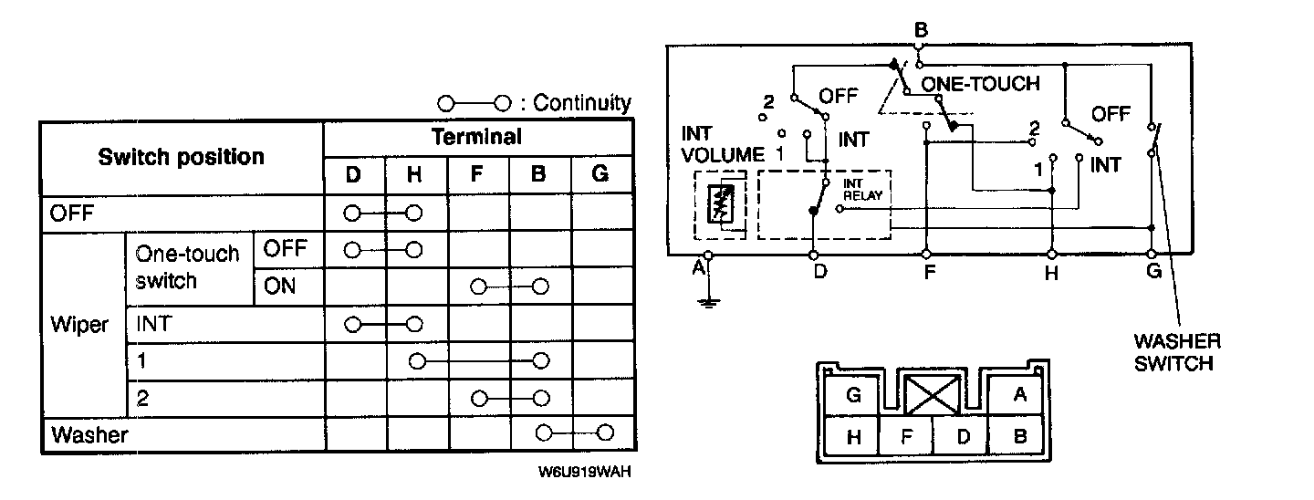 3. Inspect for continuity between the windshield wiper and washer switch terminals by using an ohmmeter.