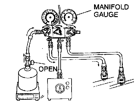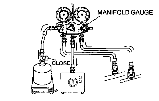 CAUTION: Close the manifold gauge valve Immediately after stopping the vacuum pump. If the valve is left open, the vacuum pump oil will backflow into the refrigeration cycle and cause a decrease in the efficiency of the air conditioner.