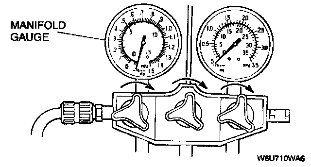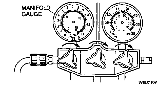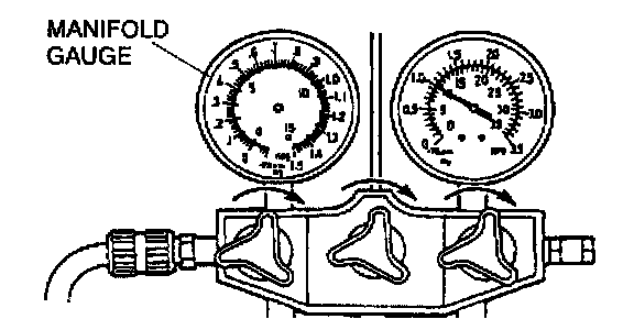 15. When the high-pressure side reading increases to 0.098 MPa {1.0 kgf/sq.cm, 14 Psi} close the low-pressure side valve of the manifold gauge.