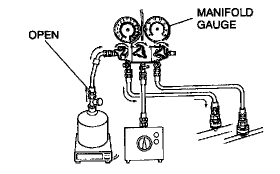 18. Open the low-pressure side valve of the manifold gauge and charge with refrigerant until the weight of refrigerant tank has decreased 350 g {12.4 oz} from the amount in step 13.