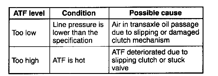 Note If the ATF level is too high or too low in hot condition, the above problems may be the cause.