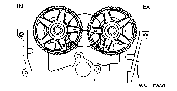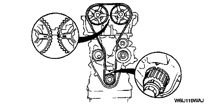 1. Verify that the timing belt pulley mark and camshaft pulley marks are aligned with the timing marks as shown.