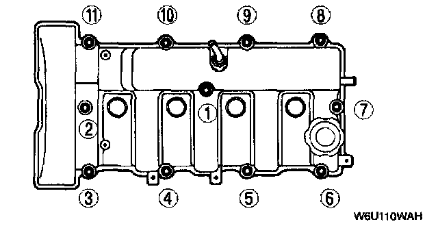 4. Tighten the cylinder head cover bolts in two or three steps in the order shown.