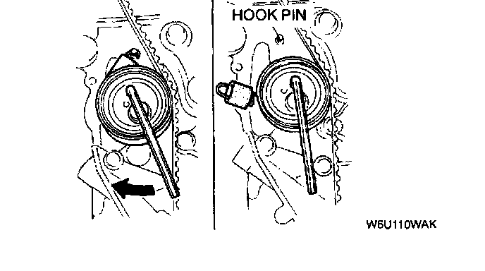 4. Disconnect the tensioner spring from the hook pin.