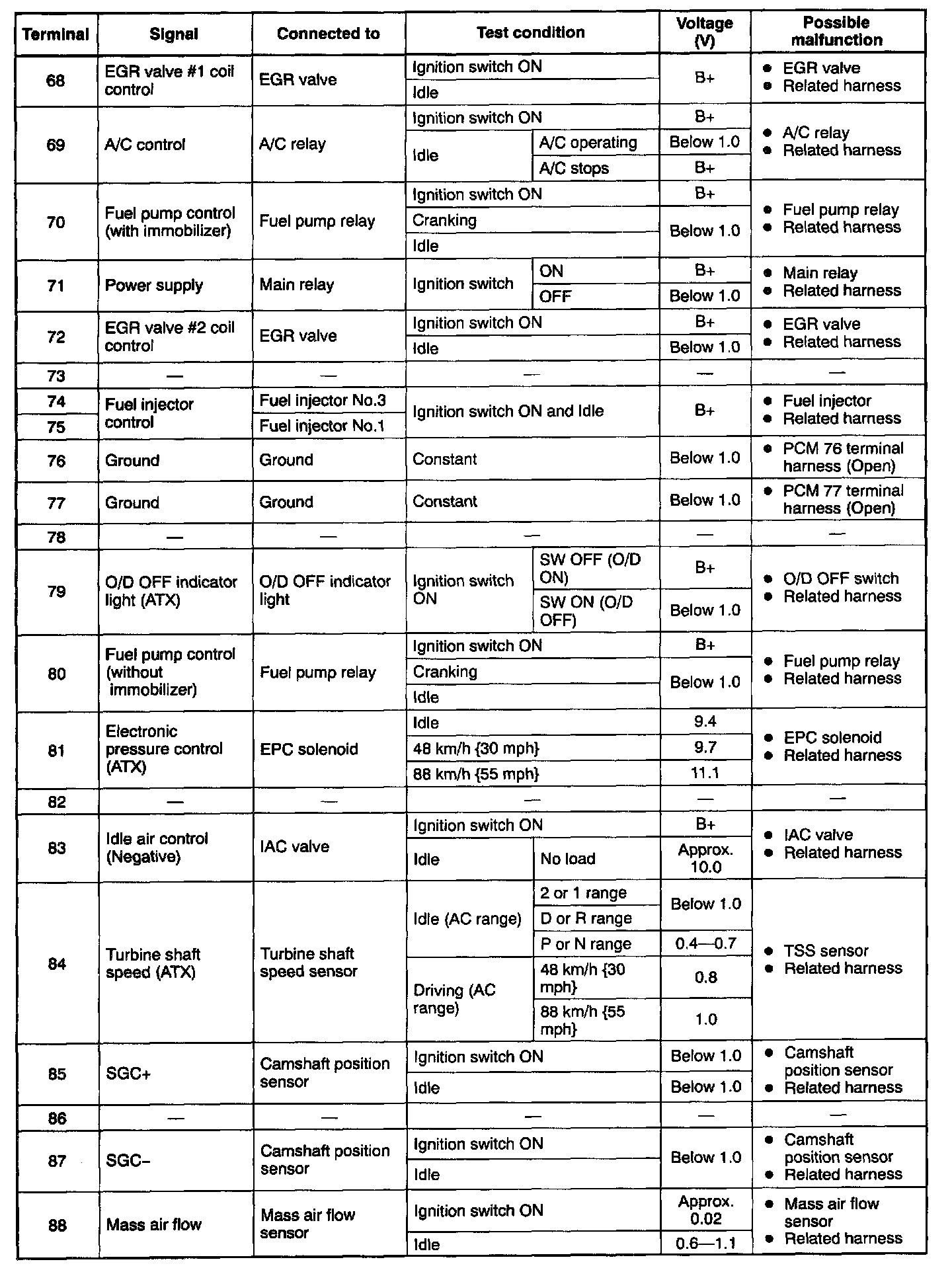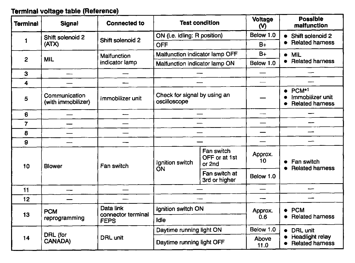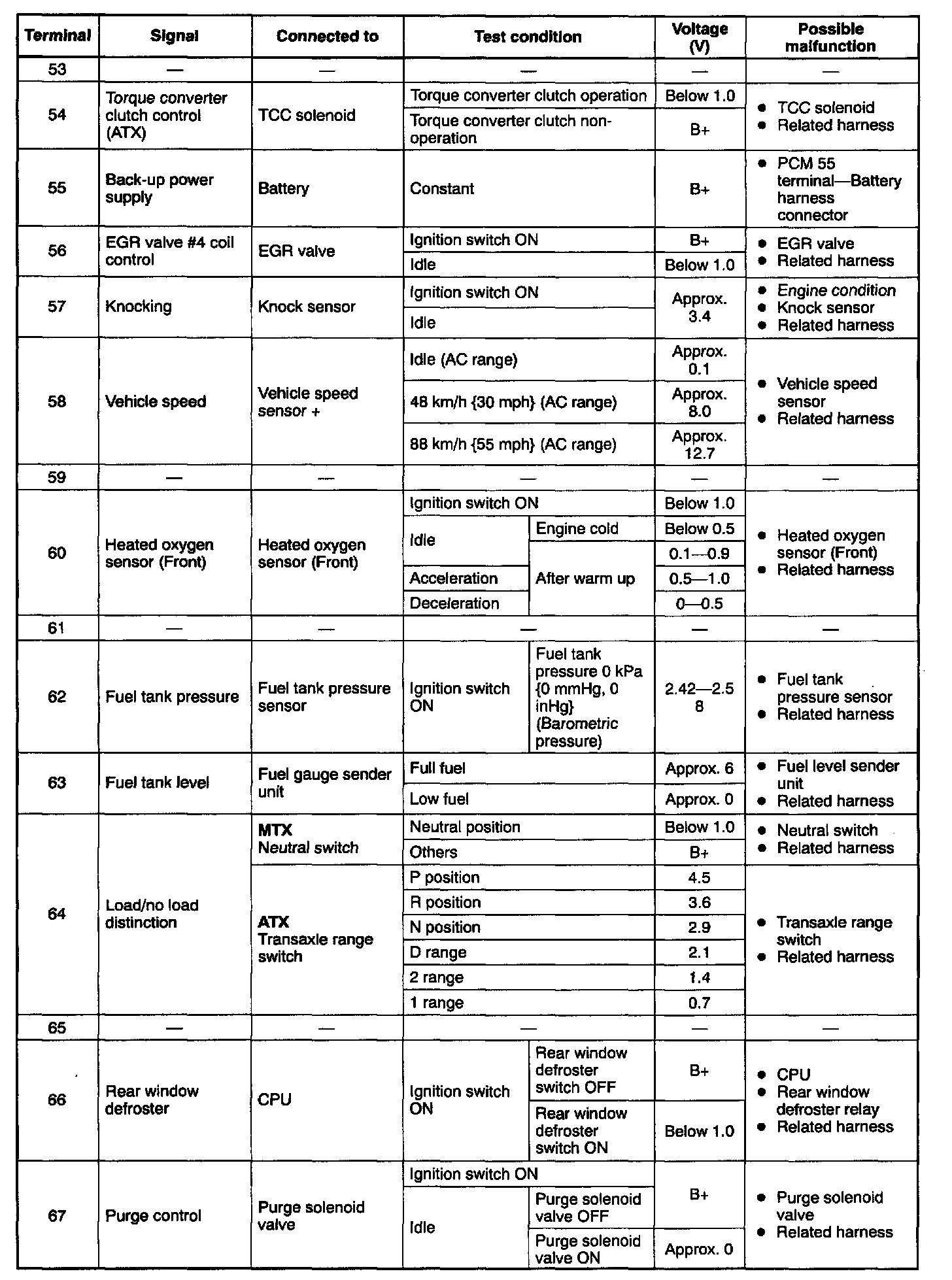 CAUTION: The PCM terminal voltages vary with change in measuring conditions and vehicle conditions. Always carry out a total inspection of the Input systems, output systems, and PCM to determine the cause of trouble. Otherwise, a wrong diagnosis will be made.