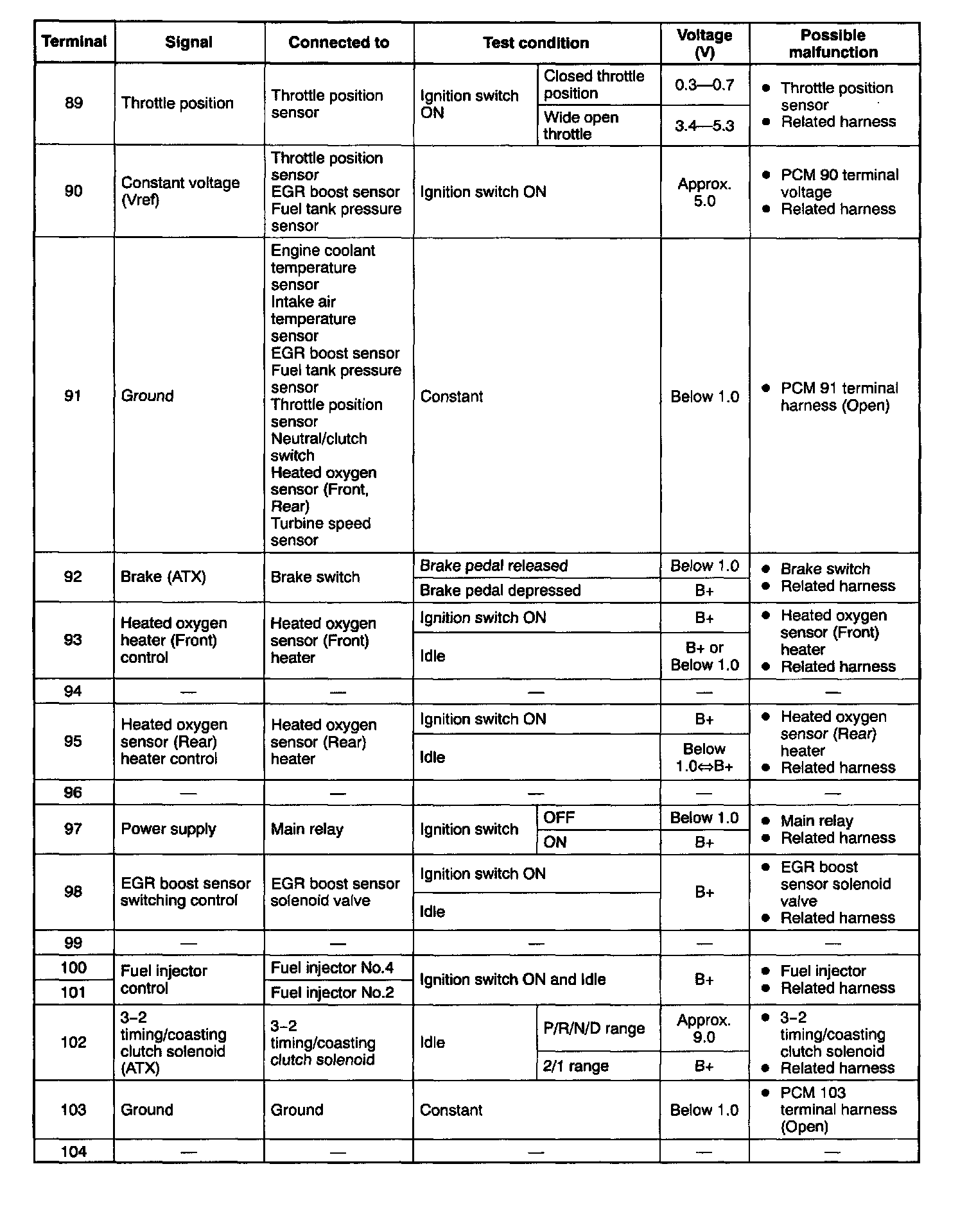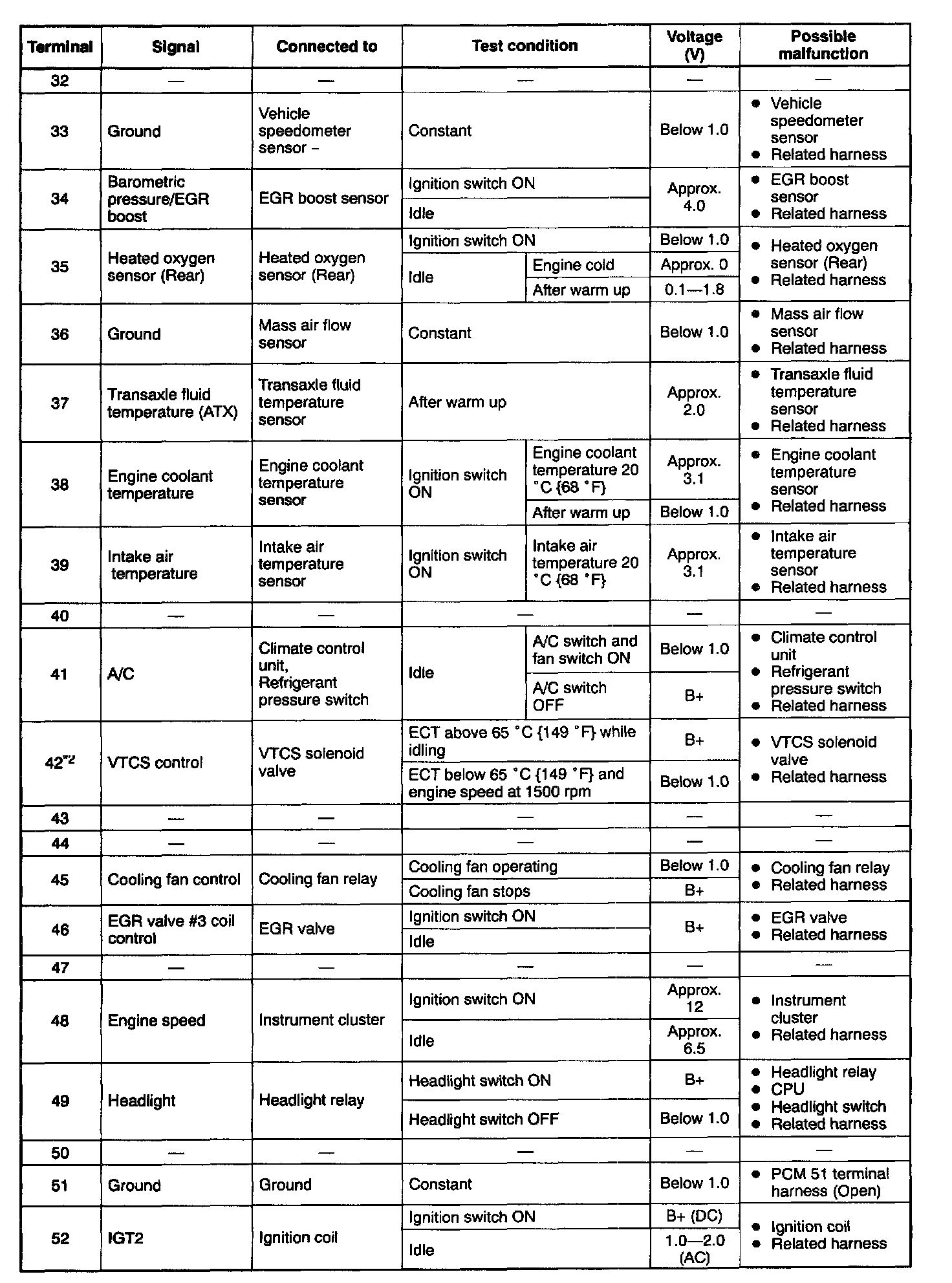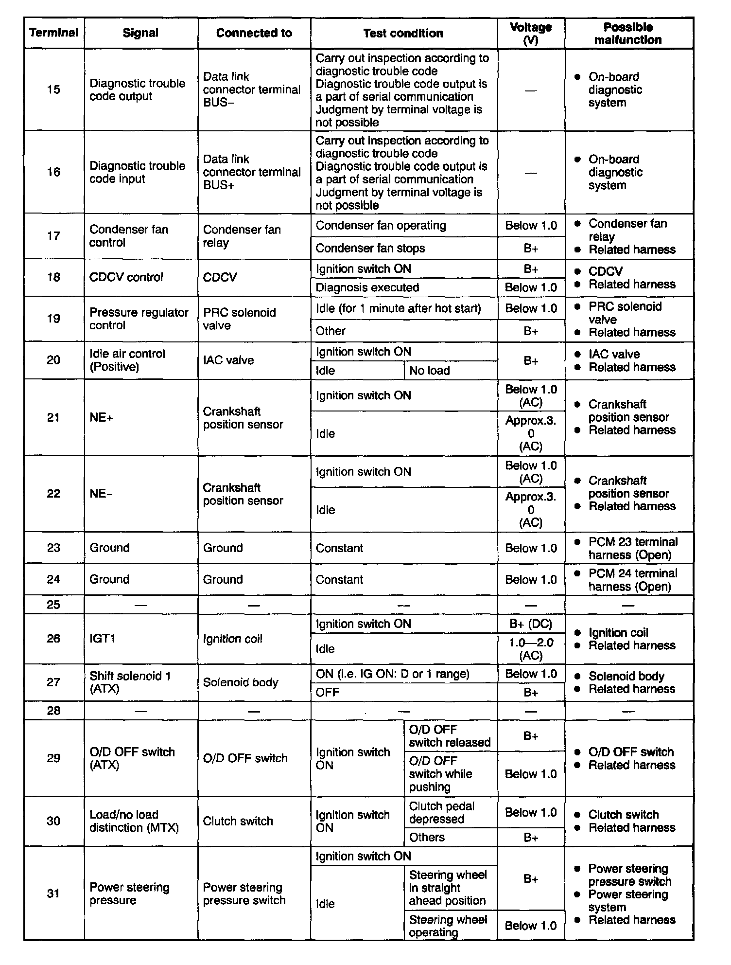 CAUTION: The PCM terminal voltages vary with change in measuring conditions and vehicle conditions. Always carry out a total inspection of the Input systems, output systems, and PCM to determine the cause of trouble. Otherwise, a wrong diagnosis will be made.