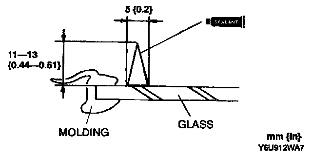 9. Once the primer is dry, apply sealant around the entire circumference to fill the gap between the dam and the edge of the molding with a 11 - 13 mm {0.44 - 0.51 in} high 5 mm {0.2 in} wide bead of sealant. Apply sealant beside the molding.
