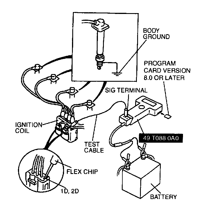 10. Verify that the spark plug produces a strong, pale spark when the cable from the SIG terminal of the SST (NGS tester) is connected to the ignition coil terminal 1D and 2D.