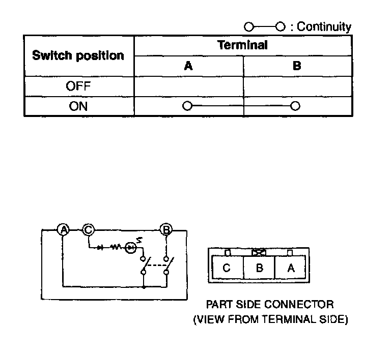 2. Inspect for continuity between the A/C switch terminals using an ohmmeter.