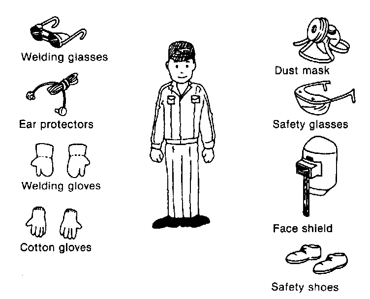 Protective head covering and safety shoes should always be worn. Depending upon the nature of the work, gloves, safety glasses, ear protectors, face shield, etc., should also be used.