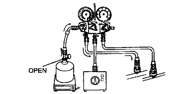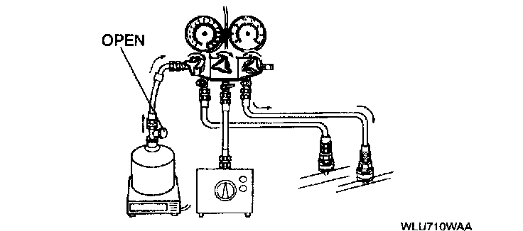 20. Open the low-pressure side valve of the manifold gauge and charge with refrigerant until the weight of the refrigerant tank has decreased 750 g {26.5 fl oz} from the amount in step 13.