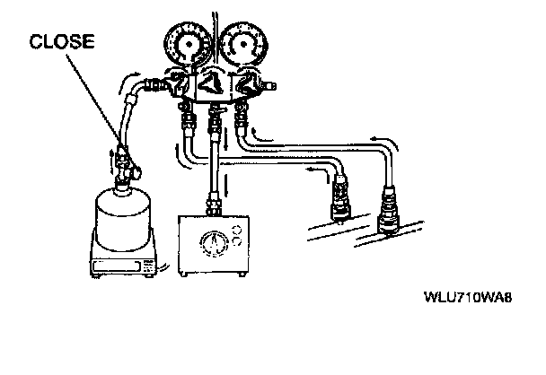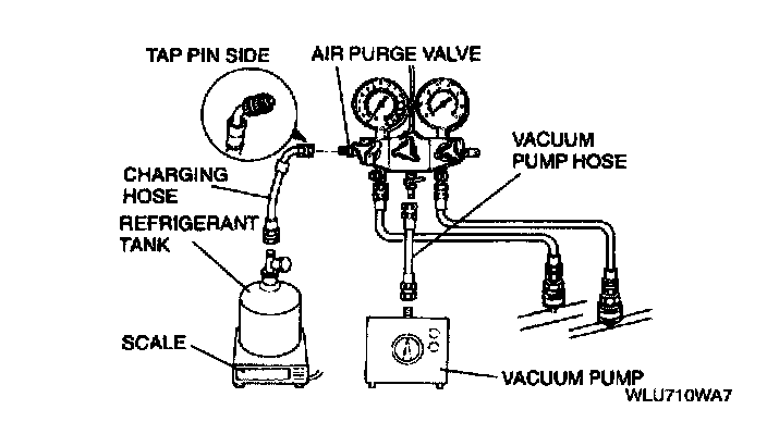 CAUTION: Close the manifold gauge valve immediately after stopping the vacuum pump. If the valve is left open, the vacuum pump oil will backflow into the refrigeration cycle and cause a decrease in the efficiency of the air conditioner.