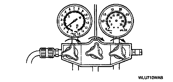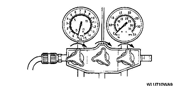 14. Open the high-pressure side valve of the manifold gauge and charge with refrigerant until the low-pressure side reading is at 100 kPa {1 kg/sq.cm, 14 psi}