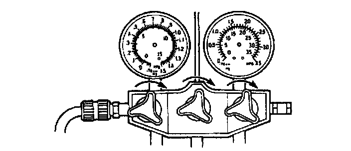 9. Verify that the high- and low-pressure side readings of the manifold gauge are at -101 kPa {-760 mmHg, -29.9 inHg}. Close each valve of the manifold gauge.
