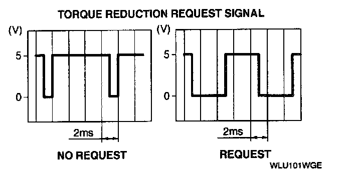 4. With no electrical load operating, inspect the torque reduction inhibit signal at the ABS/TCS control module 2R terminal using an oscilloscope.