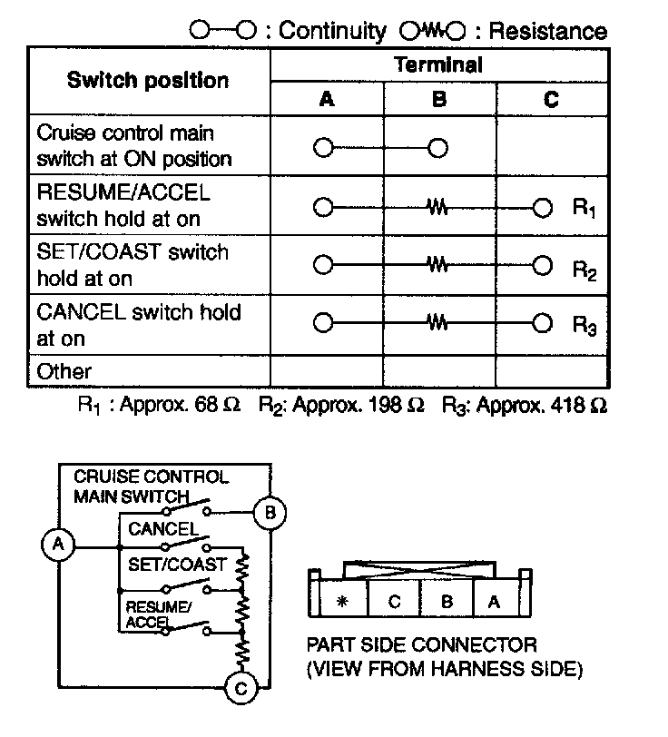 4. Measure the resistance and inspect for continuity between the cruise control switch terminals using an ohmmeter.