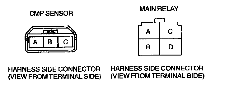 - Power circuit (CMP sensor connector terminal A and main relay terminal D through common connector to GND)