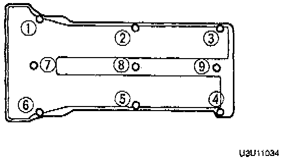 Install the cylinder head cover and tighten the bolts in five or six steps in the order shown to achieve a final torque of