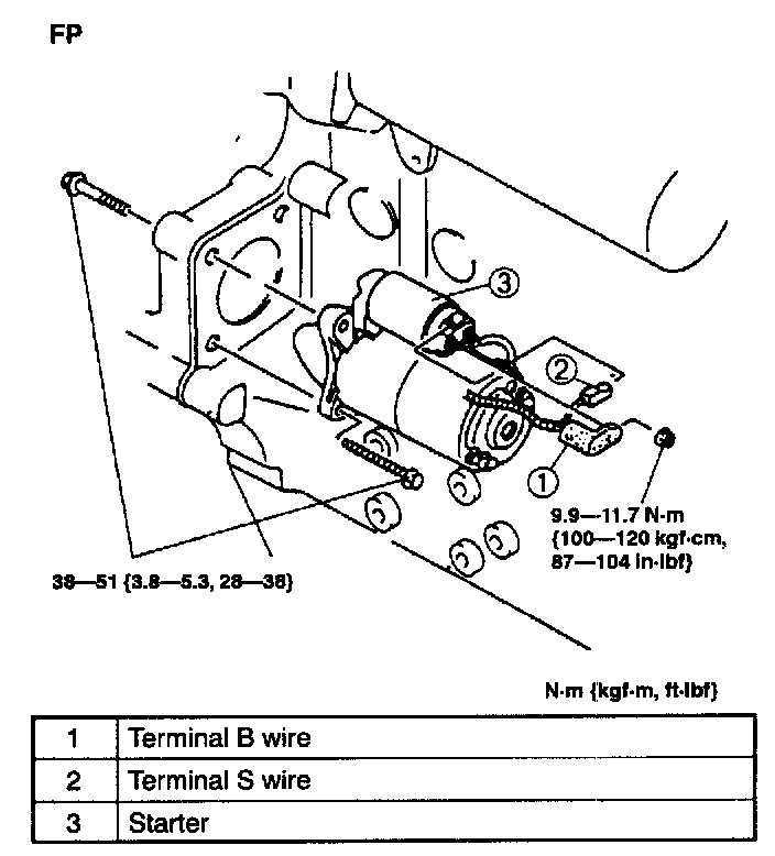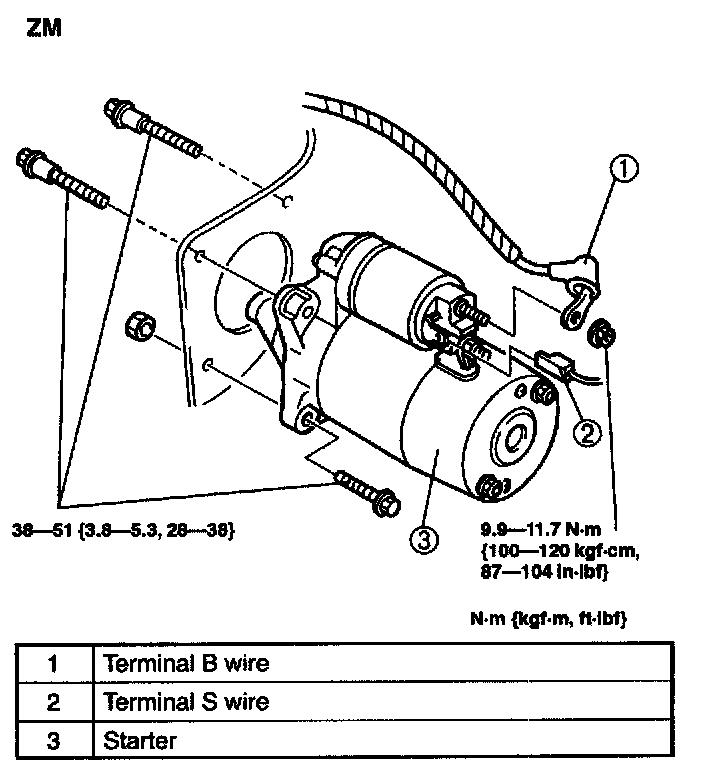 WARNING: When the battery cables are connected, touching the vehicle body with starter terminal B will generate sparks. This can cause personal injury, fire, and damage to the electrical components. Always disconnect the battery before performing the following operation.