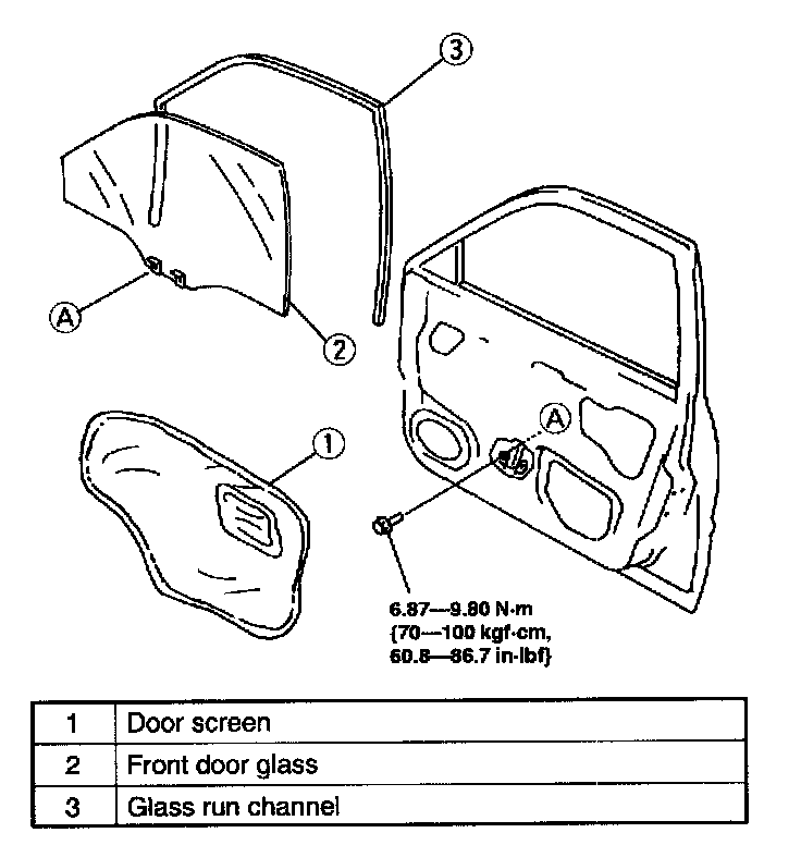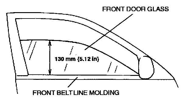 1. Lower or raise the front door glass so that the distance from the top of the front door glass at the rear end to the upper part of the front beltline molding is 130 mm {5.12 in}.