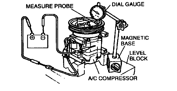 4. Turn off the magnetic clutch by disconnecting the ground from the A/C compressor body, then measure the dial gauge readings.